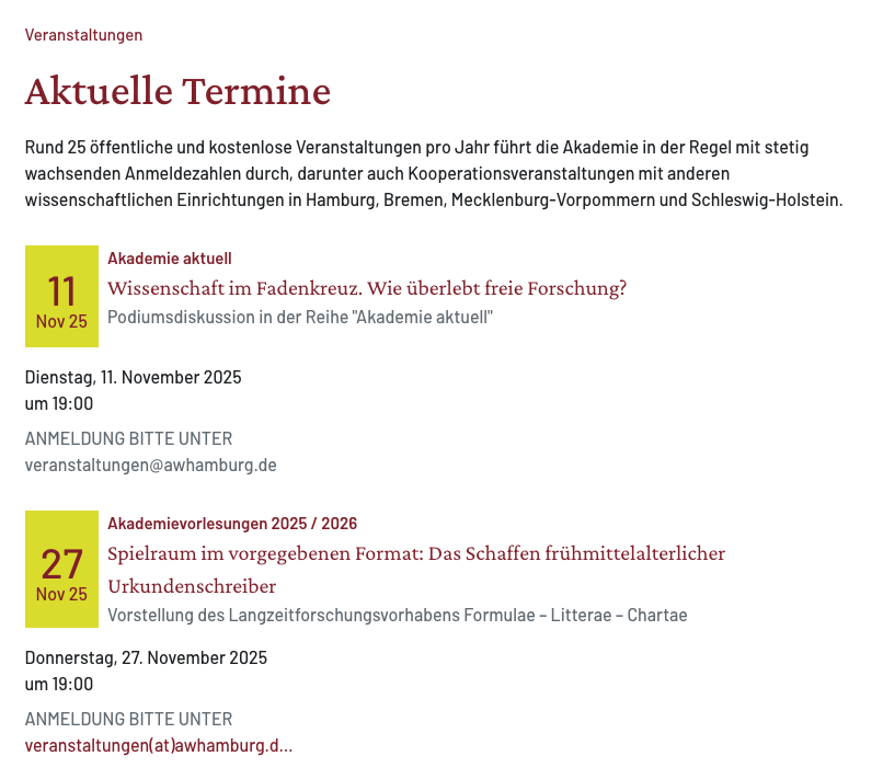Seit 2020 betreuen wir die Akademie mit Komplettrelaunch, Design-Entwicklung und kontinuierlicher Optimierung (2024 erfolgte ein umfassender Rebrush). Das Fundament bilden speziel entwickelte und konfigurierte TYPO3-Extensions, die exakt auf die Bedürfnisse einer wissenschaftlichen Institution zugeschnitten sind: