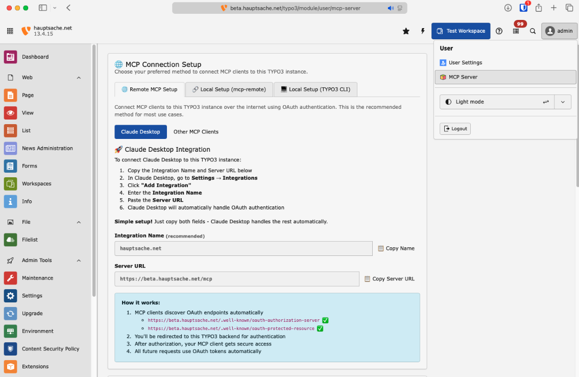 - Gehen Sie im TYPO3-Backend zu [Benutzername] → MCP Server